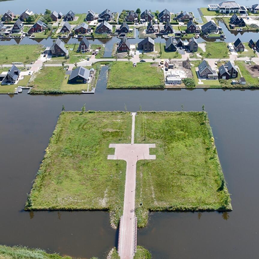 Het eiland is als een klein landgoed door een brug en een oprijlaan verbonden met de Zuiderringdijk en biedt een unieke combinatie van wonen, water, groen en privacy.